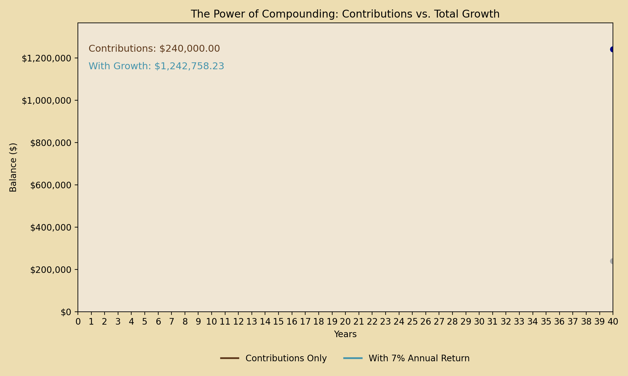 Investing isn’t just about saving money; it’s about putting your money to work. When your money earns interest, and then that interest earns interest, you’ve started a financial snowball. The graph below shows the power of compounding over 40 years. The brown line is the contributions and the blue line shows the growth.